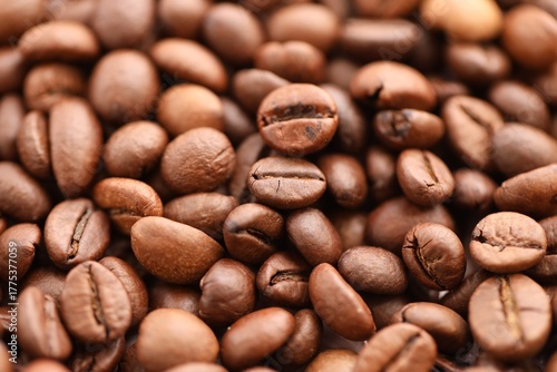© mehaniq41, Naklejka premium Big pile of fresh roasted brown coffee beans as flat background photo image with visible details close up