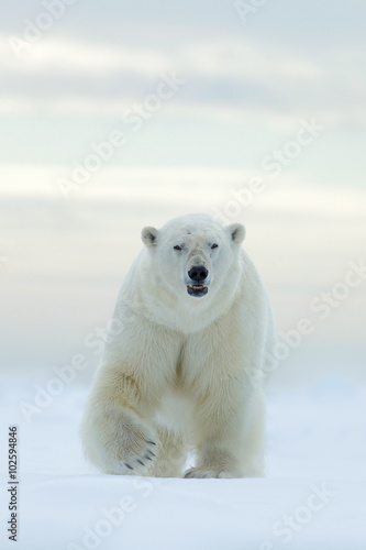 © ondrejprosicky, Fototapeta premium Big polar bear on drift ice edge with snow a water in Arctic Svalbard