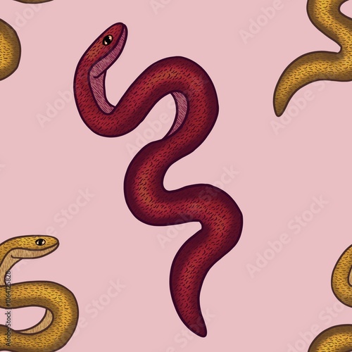 © Khrystyna Turchyn, Obraz premium Big Red and Yellow Snake with Pink Background Seamless Pattern Design