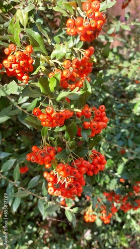 © Dmitri, Fototapeta premium Big red berries on a green bush. Autumn fruits. Rosehip for tea