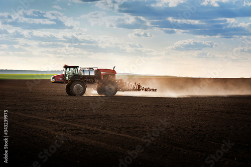 © pavlobaliukh, Fototapeta premium Big self-propelled red sprayer in the field cultivates arable land against the light