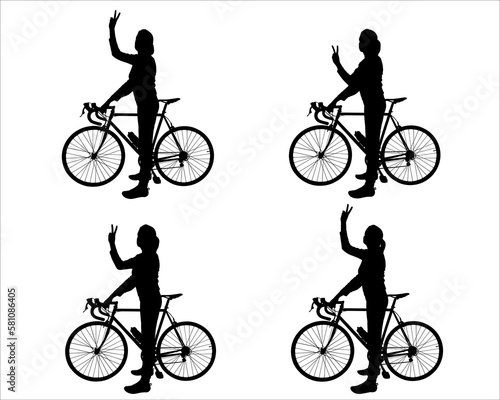 Obraz premium Big set of silhouettes of women cyclists. The girl stands near the bike and holds on to the steering wheel. A woman shows a