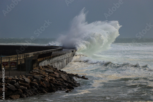 © nvphoto, Fototapeta premium Big storm waves reach a breakwater structure in a pier in the Atlantic coastline. Cascais Portugal