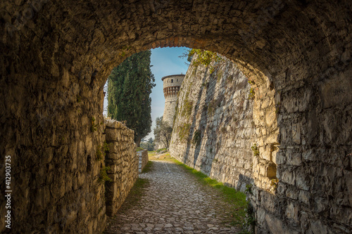 Fototapeta premium Big tower in the Medieval castle of the city Brescia on a sunny clear day...