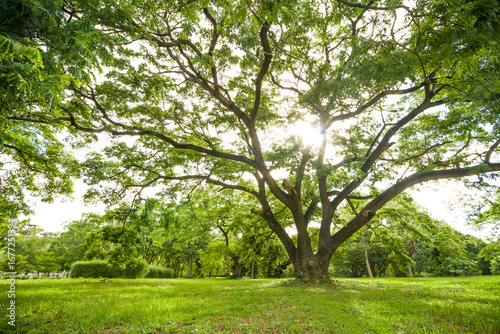 Fototapeta premium Big tree in the garden with beautiful spreading branches and sunlight shining...