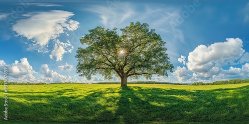 © Thanthara, Obraz premium Big tree on green field and blue sky with clouds, summer landscape