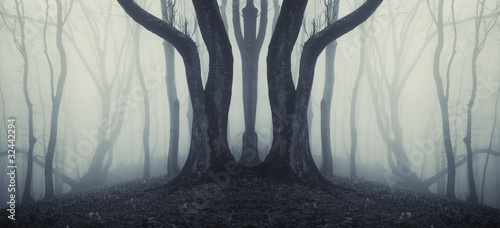 © andreiuc88, Fototapeta premium big trees in a mysterious forest with fog after rain
