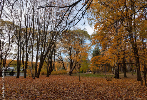 © Volnnata, Fototapeta premium Big trees with bright foliage in the park on a sunny autumn evening