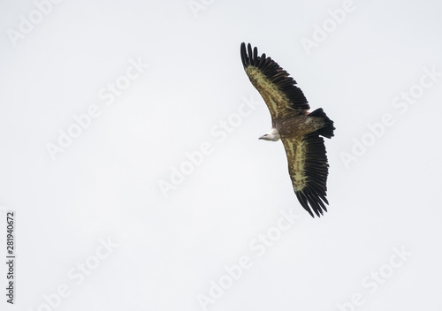 Obraz premium Big vulture bird flying against white sky. Isolated bird.