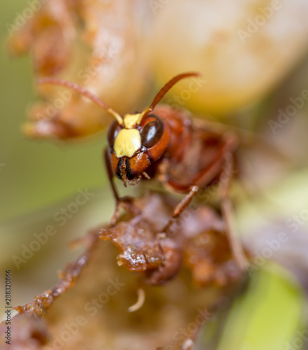 © donikz, Fototapeta premium Big wasp is eating white overripe grape. Late afternoon sun, autumn