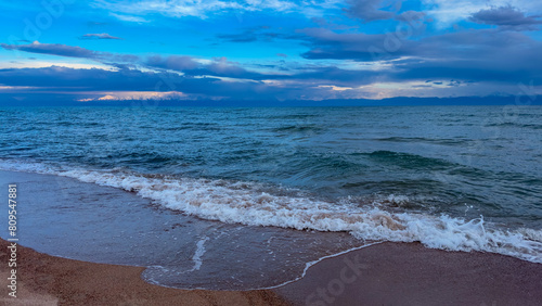 Fototapeta premium Big waves. stormy sea, thunderclouds. Kyrgyzstan, Lake Issyk-Kul