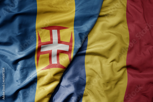 Fototapeta premium big waving national colorful flag of madeira and national flag of romania .
