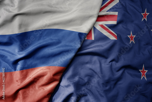 Fototapeta premium big waving realistic national colorful flag of russia and national flag of new zealand .