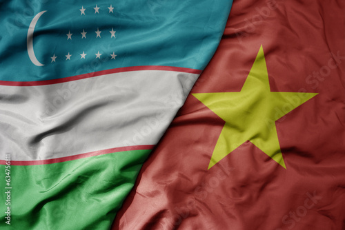 Fototapeta premium big waving realistic national colorful flag of uzbekistan and national flag of vietnam .
