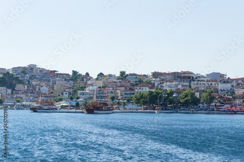 © Zoran, Naklejka premium Big white brown wooden sailboat anchored next to the dock in town.