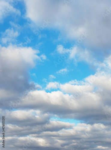 Naklejka premium Big white fluffy clouds in the blue sky in sunny weather, vertical format