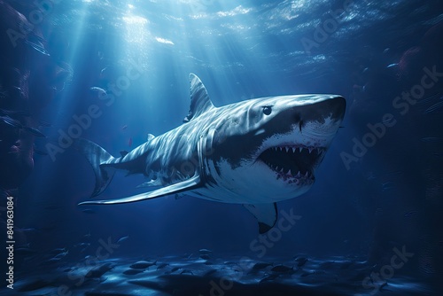© Stavros, Fototapeta premium Big white shark in the ocean during hunting.
