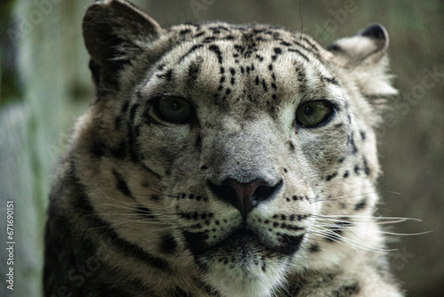 © Elena, Obraz premium Big white Snow leopard lies with piercing yellow eyes