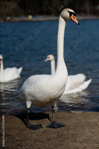 Fototapeta premium big white swan walks along shore, long-necked bird