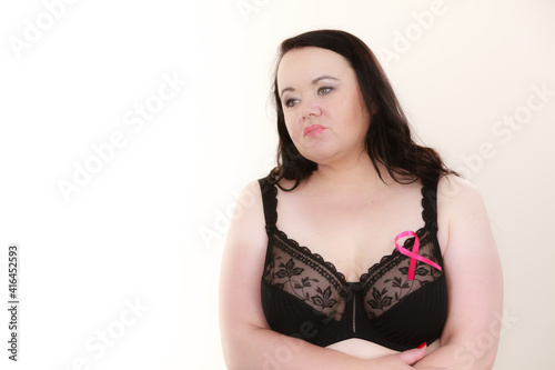 © Voyagerix, Fototapeta premium Big woman in bra with pink cancer ribbon