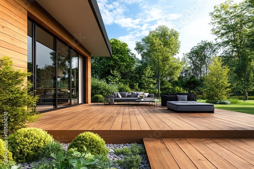 © kardaska, Obraz premium Big wooden terrace with garden furniture near modern house