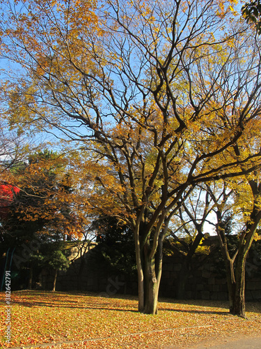 Fototapeta premium Big yellow maple tree in center of park