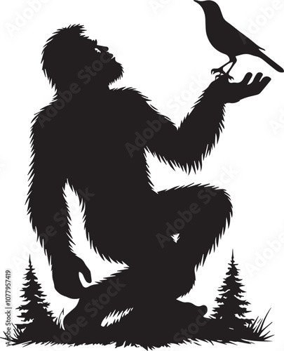 Fototapeta premium Bigfoot silhouette looking up at a bird perched on its hand