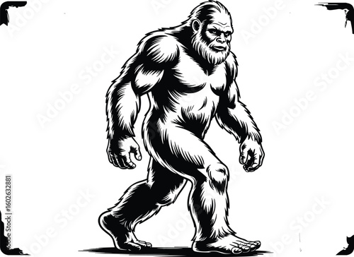 © Rita, Obraz premium Bigfoot Silhouette Vector in Forest Landscape, Sasquatch Clipart Design – Mythical Creature Illustration, Forest Monster Bigfoot SVG – Outdoor Adventure Design, Retro Bigfoot Design – Mountain Camping
