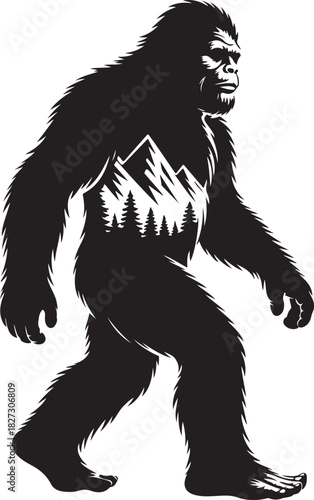 © Creative Art, Fototapeta premium Bigfoot silhouette with mountain and forest interior