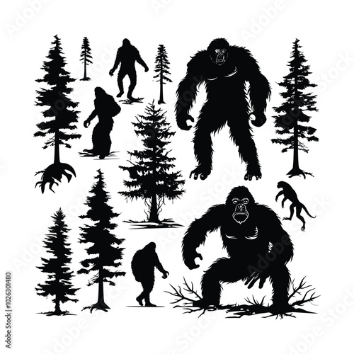 © Shamima, Fototapeta premium Bigfoot Silhouettes set Clipart on a white Background