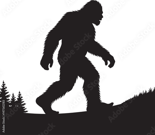 © vector , Obraz premium Bigfoot Walking Through the Forest SilhouetteMysterious Sasquatch in the Shadows VectorLegendary Bigfoot in Mountain Fog SilhouetteCryptid Creature Footprint Trail Vector ArtBigfoot Sighting i