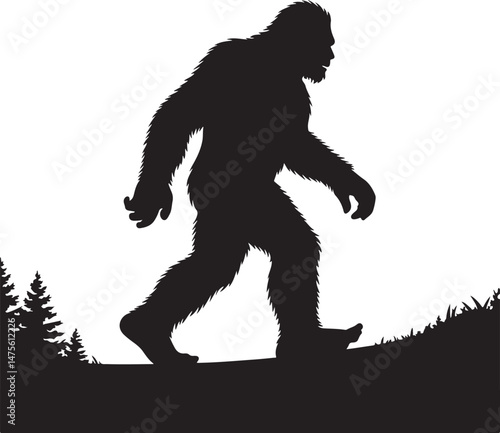 © vector , Fototapeta premium Bigfoot Walking Through the Forest SilhouetteMysterious Sasquatch in the Shadows VectorLegendary Bigfoot in Mountain Fog SilhouetteCryptid Creature Footprint Trail Vector ArtBigfoot Sighting i