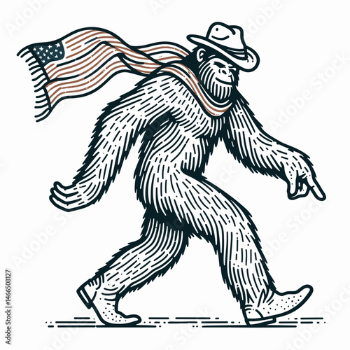 © NawapDesign, Fototapeta premium bigfoot with cowboy hat and american flag overlay scarf Dancing. Sasquatch hairy mythical creature Clipart line art vector illustration. .