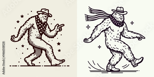 © NawapDesign, Fototapeta premium bigfoot with cowboy hat and american flag overlay scarf Dancing. Sasquatch hairy mythical creature Clipart line art vector illustration. .