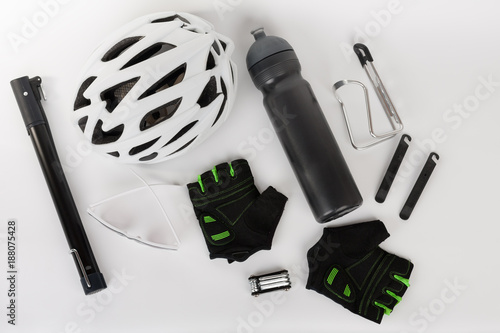 Obraz premium Bike accessories, bike helmet, bike gloves, eyeglasses and water bottle in...