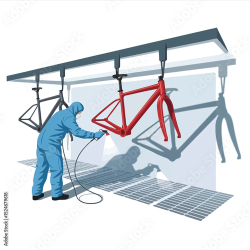 © stockphoto1, Naklejka premium Bike frame painting process illustration of a worker spraying red paint in a factory setting with overhead support and shadows
