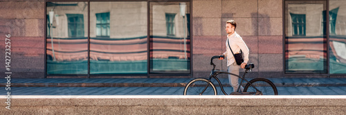 © Prostock-studio, Fototapeta premium Bike ride in city. Young hipster with bag walks with bicycle near office building, side view, copy space