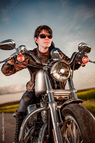 © Andrei Armiagov, Naklejka premium Biker girl on a motorcycle
