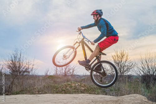 Fototapeta premium Biker on a mountain bike performing a jump. Active lifestyle.