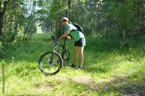 Obraz premium Biker with a mountain bike in the forest in summer