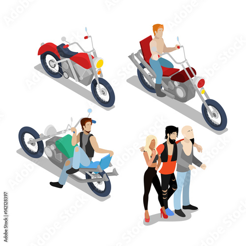 Obraz premium Bikers with Motobikes. Motorcycle Riders. Vector flat 3d isometric illustration