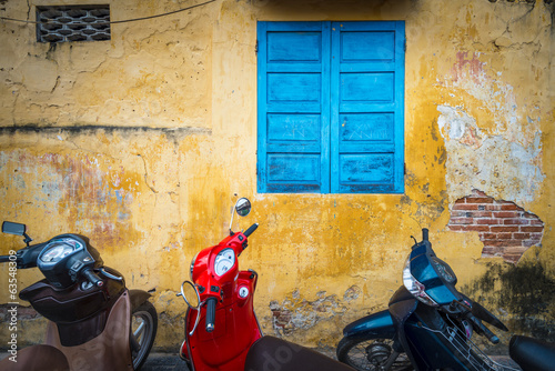 © Konstantin Yolshin, Naklejka premium Bikes parked near building with grungy wall.