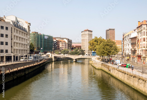 © Tomas, Obraz premium Bilbao, Spain-September 2018. River of the city with people in the shore. Describe the city life.