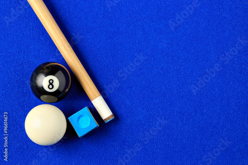 Fototapeta premium Billiard balls, cue and chalk in a blue pool table.