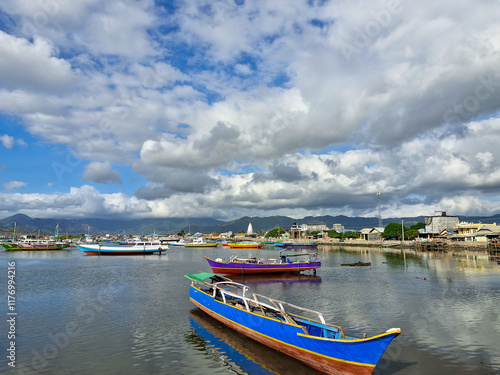 Fototapeta premium Bima, West Nusa Tenggara (....) : View of a group of fishing boats at anchor