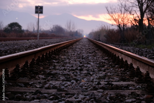 © Stefano, Obraz premium Binario arrugginito di una vecchia ferrovia, al tramonto
