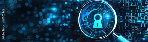 Obraz premium Binary code, blue magnifying glass, key icon, front view, highlights code...