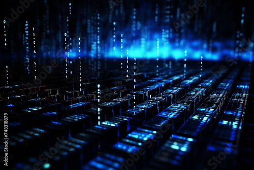 © Tanita, Obraz premium Binary matrix background. Falling digits on dark backdrop. Running random numbers. Abstract data concept. Blue futuristic cyberspace.