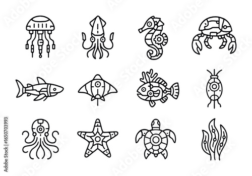 Fototapeta premium Bio-Mech Ocean Icons. Outline icon set of bio-mech ocean life: robotic...