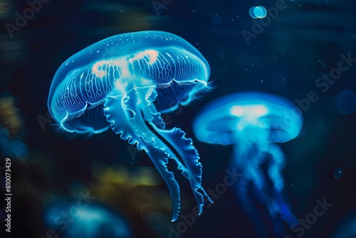 Naklejka premium Bioluminescent blue jellyfish in the deep dark ocean waters.